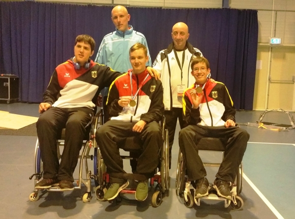Das deutsche Team: vorne die Athleten Nils Neumann, Julius Haupt, Felix Schrader, hinten links Harut Khachatryan
